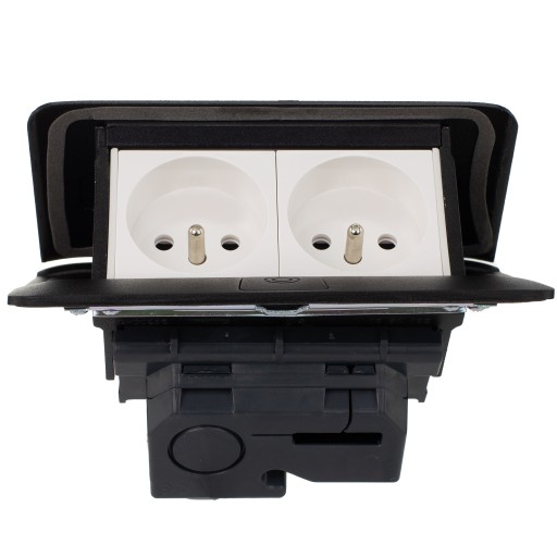 - Minipuszka Pop-up wyposażona w czarne gniazda z uziemieniem 2P+Z.