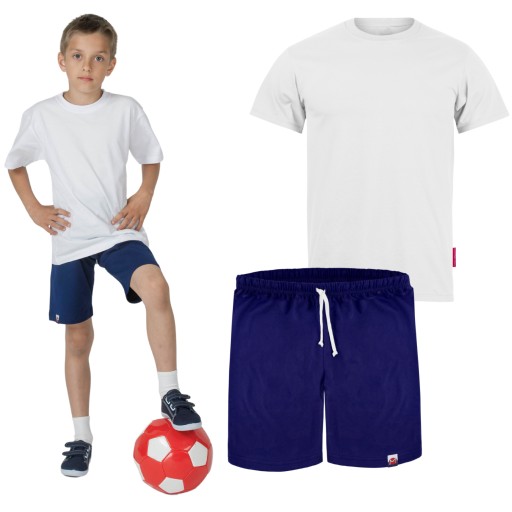 Zestaw wykonany z wysokogatunkowej 100% bawełny, dzięki czemu skóra Twojego dziecka oddycha. Spodenki posiadają elastyczną gumkę w pasie. Zestaw idealnie nadaje się na zajęcia sportowe w szkole, oraz inne aktywności sportowe.