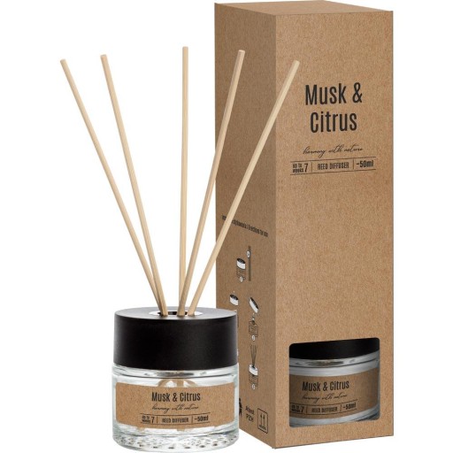 Dyfuzor zapachowy MUSK & CITRUS w eleganckim szkle o pojemności 50 ml.