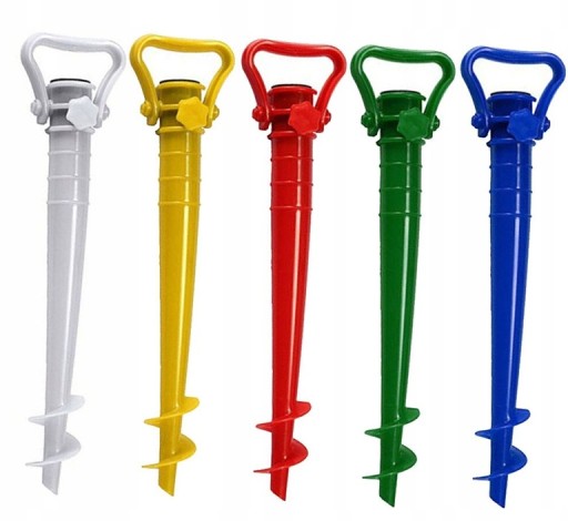 Kotwa mocująca w kształcie świdra pozwala na łatwe i szybkie zamocowanie w ziemi lub piasku parasola ogrodowego, suszarki na pranie, wsporników namiotu itp.