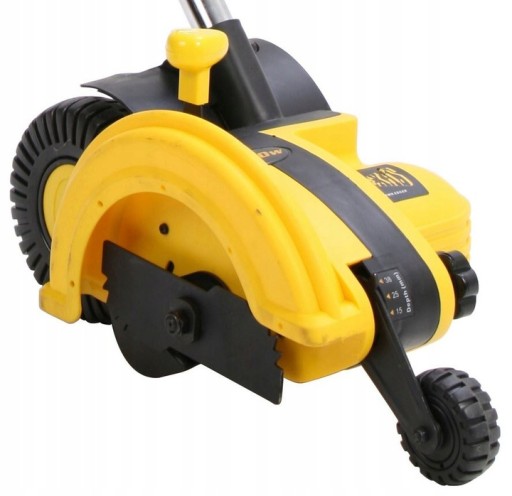 Elektryczna obcinarka krawędzi z silnikiem elektrycznym o mocy 1400 W i regulowanym uchwytem teleskopowym. Duże tylne koła stabilizują pracę.