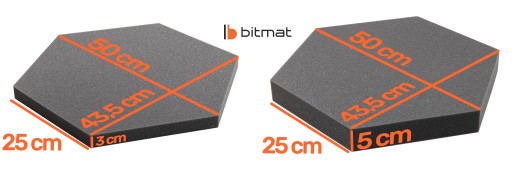 10 paneli akustycznych typu heksagon bez kleju 50 cm x 43,5 cm = 5 sztuk o grubości 3 cm + 5 sztuk o grubości 5 cm.