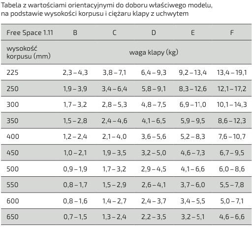 Wybór modelu do klap jednoczęściowych zależy od wysokości korpusu oraz ciężaru całkowitego klapy. Wyboru należy dokonać na podstawie tabeli załączonej poniżej.