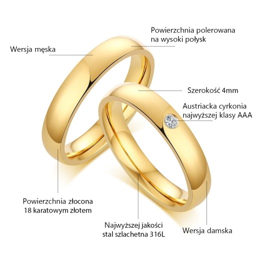 Luksusowe obrączki ślubne wykonane z najwyższej jakości stali szlachetnej, chirurgicznej 316L. Te obrączki to wyjątkowo szlachetne połączenie stali i złota. Perfekcyjne wykonanie z wysoką dbałością o wszelkie detale oraz połysk gwarantują produkt najwyższej jakości. Doskonała kompozycja stworzona, by cieszyć, zachwycać i podkreślać miłość, jaką darzą się osoby decydujące się na wspólne życie. Idealne obrączki, które chciałoby się nosić na palcu przez cały czas i nie zdejmować ich nawet na chwilę.