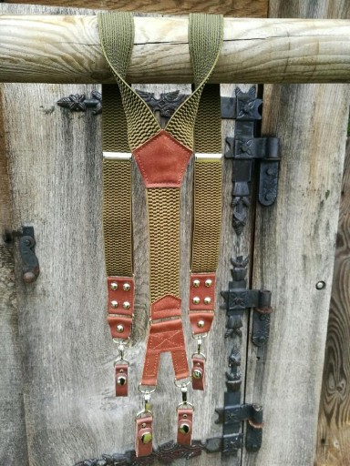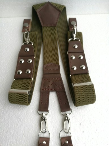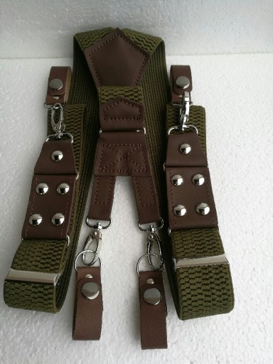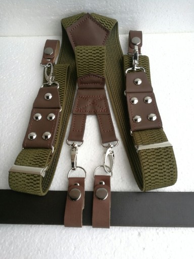WYKONANE Z DOBREJ JAKOŚCIOWO GUMY SZELKOWEJ.POSIADAJĄ REGULACJĘ DŁUGOŚCI A SOLIDNE SZLUFKI I KARABIŃCZYKI DOBRZE UTRZYMUJĄ SPODNIE NA PASKU.WSTAWKI WYKONANE SĄ Z WYSOKO GATUNKOWEJ SKÓRY LICOWEJ KOLORU BRĄZOWEGGO DZIĘKI TEMU SZELKI BĘDĄ SŁUŻYŁY PRZEZ DŁUGI CZAS.SREBRNY KOLOR METALOWYCH RAMEK,NAPY, KARABIŃCZYKÓW,REGULATORÓW.NITY KALETNICZE 11 MM STALOWE BOMBKA.GUMA SZEROKA NA 4 CM.ROZCIĄGAJĄCA SIĘ NA 160 CM.SZLUFKI SKÓRZANE PASUJĄ NA SZEROKOŚĆ PASA DO 4 CM.JEST MOŻLIWOŚĆ ZAMÓWIENIA SZERSZEJ SZLUFKI.