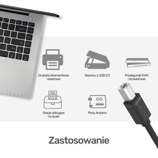 Podłącz drukarkę lub inne urządzenie peryferyjne kablem USB 2.0 odpowiedniej długości. Po jednej stronie znajduje się wtyczka USB A, po drugiej USB B. Przewód jest dostępny w długościach 1 m, 2 m, 3 m i 5 m.