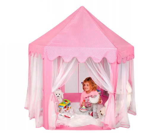 Materiałowy namiot jest zdecydowanie niezastąpionym kompanem podczas dziecięcych figli. Ma podstawę sześciokąta, posiada 6 otworów wejściowych i daszek w kształcie ostrosłupa. Zabawka charakteryzuje się atrakcyjnym wyglądem. Różowy kolor poszycia oraz paski nadają walorów estetycznych. Wejścia są zasłonięte półprzezroczystymi, białymi firankami, które doskonale komponują się z pozostałą częścią namiotu. Gardinki można przewiązać bądź udrapować na różne sposoby przy pomocy ozdobnych tasiemek. Zastosowane rozwiązanie wraz z kokardkami dodaje uroku, a także urozmaica zabawę.