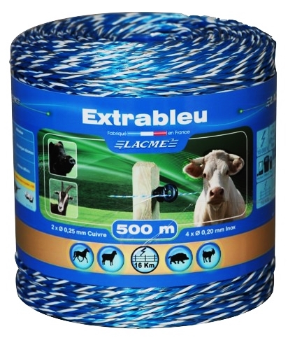 Wysokiej jakości gruba plecionka o długości 500 metrów. Służy ona do budowy ogrodzeń elektrycznych dla tzw. trudnych zwierząt czyli tych z grubą sierścią. Cechuje się wytrzymałością, dobrą przewodnością prądu i trwałością. Charakteryzuje się dłuższą żywotnością, niż zwykłe plecionki drutu itp. przewodniki. Kolejnym atrybutem przemawiającym na korzyść tej linki jest możliwość łatwego rozwijania i zwijania. Linia Lacme Extrableu oferuje bardzo trwałe, sprawdzone przewodniki ze stali nierdzewnej. Przeznaczona do średnich i długich ogrodzeń. Doskonały współczynnik ceny do jakości.