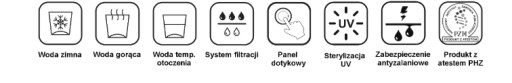- Wskaźnik dla rodzaju wody: 3 rodzaje: schłodzona, niegazowana, gorąca. Woda gorąca z opcją wyłączenia i uzyskania po wyłączeniu grzania wody w temp. otoczenia.