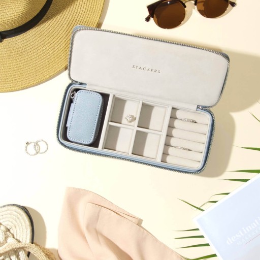 Przechowywanie cennej biżuterii bywa problematyczne, szczególnie podczas podróży. Z pomocą przychodzą pomysłowe i praktyczne produkty marki Stackers. Etui ma poręczny, prostokątny kształt i jest zamykane na zamek błyskawiczny, dzięki czemu nie otworzy się przypadkowo podczas transportu. W środku znajdują się specjalne przegródki zaprojektowane z myślą o przechowywaniu pierścionków, kolczyków czy bransoletek. W razie potrzeby przegródki można wyjąć, dzięki czemu w etui zmieszczą się nawet większe akcesoria.
