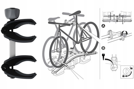 ✅ Łatwość w mocowaniu roweru zapewnia specjalne ramię z dwoma szczękami chwytającymi ramę przedostatniego roweru z ramą ostatniego roweru. Ramię wyposażone jest w zamykaną na kluczyk gałkę zabezpieczającą rower przed kradzieżą.