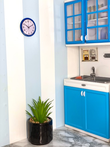 Ręcznie robiony miniaturowy zegar ścienny z nowoczesną tarczą w kilku kolorach do wyboru, idealny do domków dla lalek, do pokoi dziecięcych, szkoły, kuchni, salonu itp. Tarcza wydrukowana jest na papierze fotograficznym, pokryta taśmą klejącą w celu zapobiegnięcia uszkodzeniom, naklejona na drewniany krążek pokryty czarną, czerwoną, niebieską, białą lub srebrną farbą olejną.