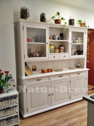 - Kredens Blanca w stylu rustykalnym nadaje pieknego wyglądu w każdym pomieszczeniu czy jest to kuchnia czy salon.Góra kredensu jest zwykle przeszklona ( chyba zę klienci wolą opcję z pełnym frontem) posiada dwie małe szuflady oraz otwartą półkę,za szklanymi drzwiczkami znajdują sie półki ,dół kredensu to przestrona komoda z trzeba pojemnymi szufladami, natomiast za drzwiczkami znajduje sie jedna półka..