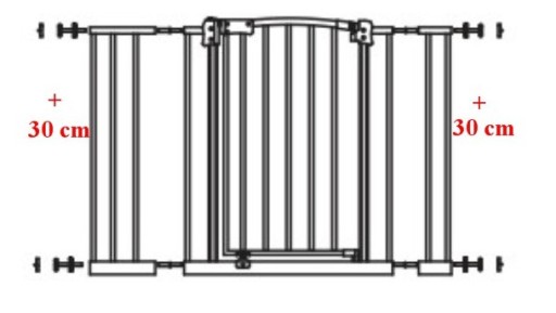 Bramkę zabezpieczającą, która ma standardowy wymiar montażu wynoszący 73-82 cm. Dodatkowo, dołączone są dwa rozszerzenia 30cm. Dzięki tym rozszerzeniom, bramka może być dostosowana do szerokości otworu o następujących wymiarach rozmiarach: