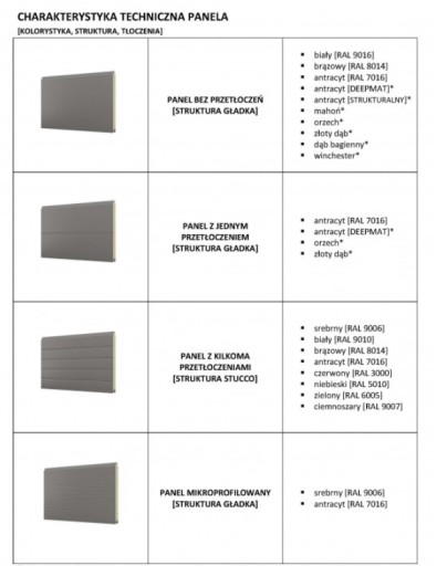 1. Bez przetłoczeń, struktura gładka: kolor biały 9016, brąz 8014, antracyt 7016, antracyt (Strukturalny), antracyt (Deepmat), kolor mahoń, kolor Orzech, kolor Złoty dąb, kolor winchester.
