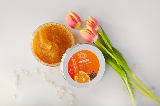 Solno – cukrowy peeling do ciała o pięknym zapachu soczystej pomarańczy ze szczyptą cynamonu. Mieszanka kryształków soli i cukru dokładnie oczyszcza skórę i idealnie ją wygładza. Zawarte w peelingu masło Shea i roślinne olejki: winogronowy, ze słodkich migdałów i sojowy pielęgnują skórę, głęboko ją nawilżają i odżywiają. Skóra po użyciu peelingu solno - cukrowego jest dokładnie oczyszczona, miękka, jedwabiście gładka i pachnąca.