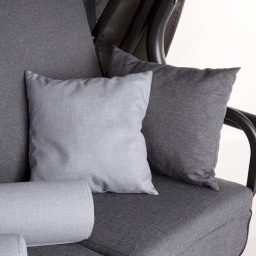 Razem z huśtawką ogrodową znajdują się komplet 3 poduszek na siedzisko z oparciami, dające dużą wygodę w trakcie użytkowania. Dodatkowo zestaw uzupełnia aż 6 dopasowanych kolorystycznie poduszek. Wśród nich są dwa miękkie boczne oparcia, które mocuje się do stelaża za pomocą rzepów, dwa jaśki, a także dwa dekoracyjne wałki.