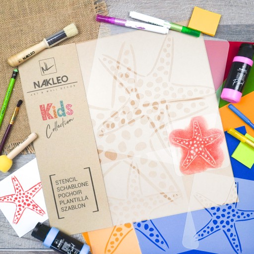 Nakleo Kids Collection to zestawy pięciu szablonów wykonanych z wytrzymałego tworzywa sztucznego składające się z arkuszy o wymiarach od 34x34cm do 9x9cm. Szablony można używać dowolną ilość razy dzięki czemu z łatwością pokryjesz nawet największe ściany dowolną kompozycją wzorów i kolorów. Daj się ponieść fantazji, spraw frajdę sobie i swojemu dziecku. Rozgwiazda pięknie ozdabia dna oceanów, niech ozdobi również Wasze wnętrza. Przenieś fragment rafy koralowej na swoje ściany! A może, dzięki innym wzorom z kolekcji marynistycznej, nie będzie to tylko fragment?