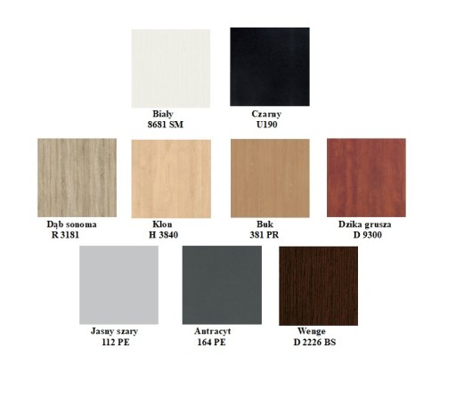 KOLORY z palety do wyboru: biały, jasny szary, antracyt, klon, buk, dąb sonoma, dzika grusza, wenge, czarny
