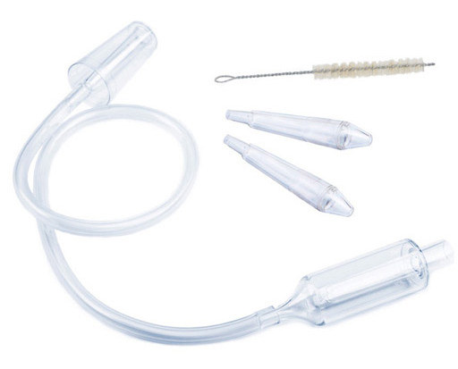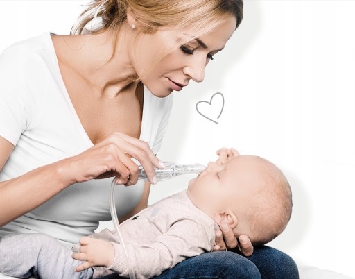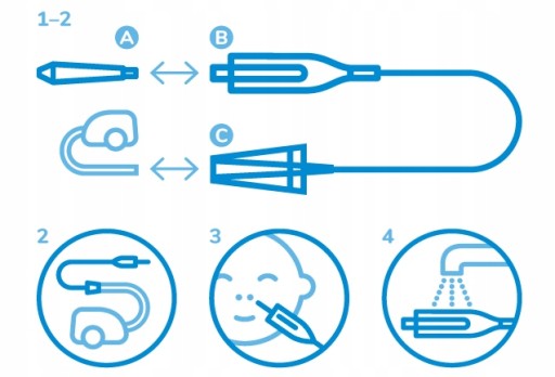 - Weź niemowlę na ręce lub posadź dziecko na kolana. Końcówkę A przyłóż do otworu nosowego i odciągaj katar 5 –10 sekund. Czynność powtórz na drugiej dziurce.
