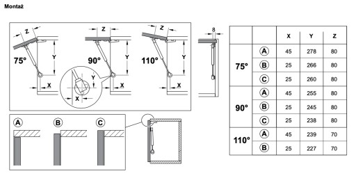 - Kąt otwarcia - 75, 90 lub 110 stopni