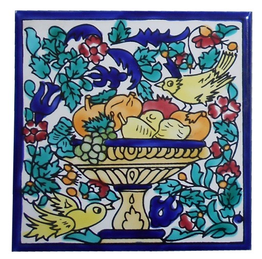 PRZEPIĘKNA ORYGINALNA ARABSKA KAFLA, RĘCZNIE MALOWANA, Z ORIENTALNYM MOTYWEM ARABSKIEGO WAZONU PEŁNEGO OWOCÓW, PTACTWA ORAZ BAJECZNYCH APLIKACJI.