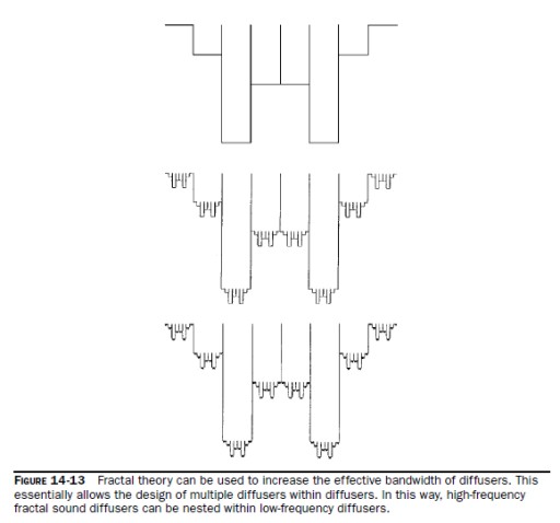 W celu zwiększenia efektywnej szerokości pasma użyto projektu dyfuzora QRD złożonego z fraktali. Jak widać na zdjęciach są to małe dyfuzory QRD w studniach dużego dyfuzora QRD.
