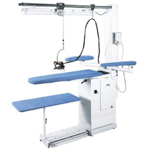 Uniwersalny stół prasowalniczy. Posiada nadmuch, podgrzewanie blatu i odsysanie pary. Wyposażony w komin.