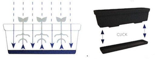 Skrzynka Lobelia posiada w dnie doniczki zintegrowany system nawadniający. Pozwala to na utrzymanie odpowiedniego stanu wilgotności podłoża. Zintegrowana podstawka do doniczki mocowana jest na zatrzaski.