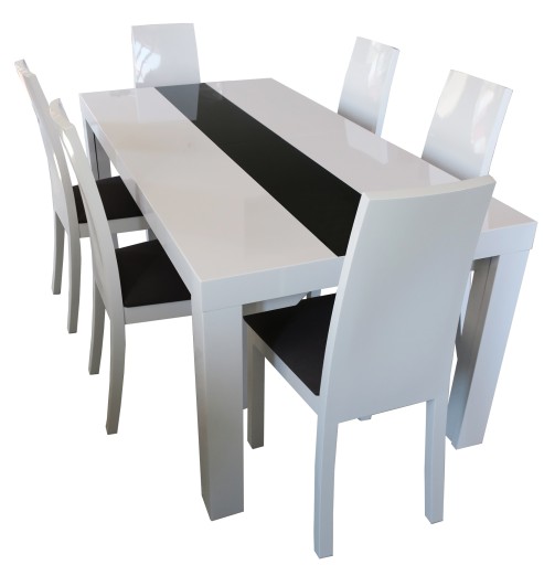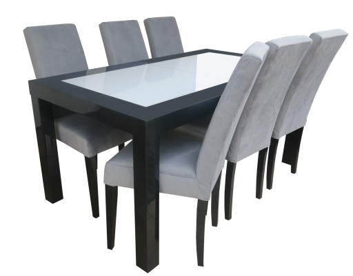 Masywny stół wykonany z płyty meblowej lakierowanej na wysoki połysk - high gloss. Blat rozsuwa się wraz z nogami na solidnych aluminiowych nowoczesnych prowadnicach stopniowo o jeden lub dwa wkłady powiększające. Nogi, rama stołu i kanty wykonane są z drewna i lakierowane w tym samym odcieniu w połysku. Stół jest ręcznie polerowany