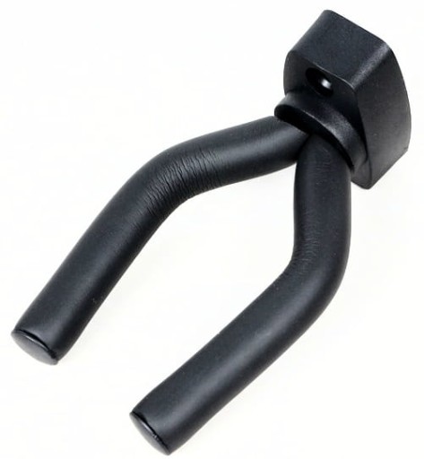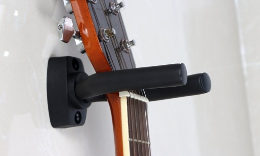 Dobrej jakości wieszak ścienny na gitarę.