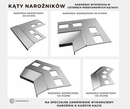 - Narożniki 90 i 135 stopni (wewnętrzne i zewnętrzne)