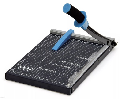 Gilotyna biurowa z ręcznym systemem docisku papieru.