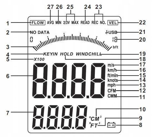 Wskazuje prędkość wiatru w 6 jednostkach m.in. km/h, m/s.