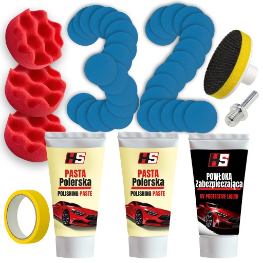 HS ZESTAW XXL DO POLEROWANIA RENOWACJI LAMP REFLEKTORÓW (32 KRĄŻKI ŚCIERNE + 3 X GĄBKA POLERSKA + 2 X PASTA DO REFLEKTORÓW+ POLIMEROWA POWŁOKA ZABEZPIECZAJĄCA)