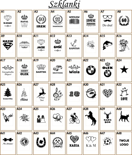 W wiadomości należy podać 3 symbole wzorów ( dla karafki, skrzynki i szklanki - grawerujemy jednakowy wzór na każdej ze szklanek).