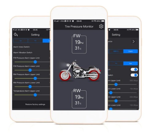 Zestaw czujników TPMS zapewni Ci bezpieczeństwo na drodze. Będzie monitorował ciśnienie w oponach oraz temperaturę. Zestaw w ciągu 6 sekund od zmiany ciśnienia wyśle informacje do Twojego telefonu za pomocą Bluetootha. Aplikacja na smartfonie w czasie rzeczywistym pozwala na kontrolę najważniejszych parametrów za pomocą dotknięcia palcem.