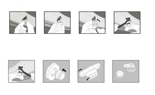 Montaż czujników z zestawu jest bardzo prosty i szybki. Odkręcamy stare nakrętki na wentyle. Następnie nakręcamy antykradzieżowe nakrętki a po nich czujniki wg oznaczenia czujników: F.W - przednie koło, R.W - tylne koło. Dokręcamy ręcznie nakrętkę antykradzieżową jak najbliżej czujnika, którą następnie dociągamy za pomocą klucza dołączonego do zestawu.