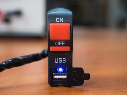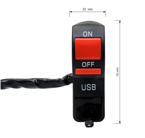 Włącznik, przełącznik ON/OFF motocyklowy do montażu na kierownicę 22 mm zintegrowany z ładowarką USB 5 V 2A.