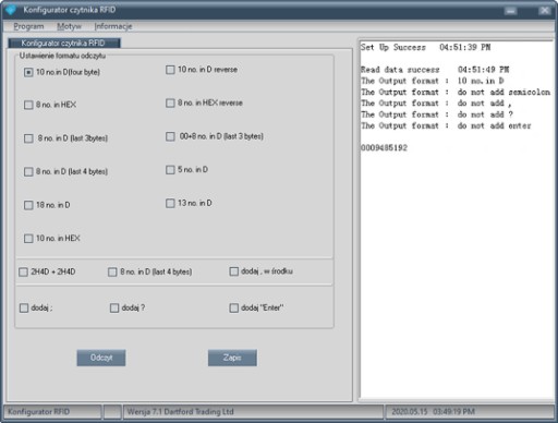 Tylko w naszej ofercie dostępny jest nasz program w języku polskim współpracujący z naszym czytnikiem i umożliwiający zmianę formatu odczytu danych z transpondera RFID. Wraz z instrukcją w języku polskim dostępny jest do pobrania z naszego serwera: http://securityrevolution.ie/Konfigurator.RFID.zip