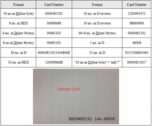 Standardowo format odczytu 8H10D (4B) z karty o numerze seryjnym 00:90:BB:88 odczytuje 0090BB88, konwertuje na system dziesiętny i zwraca numer 0009485192 oraz znak nowej linii.