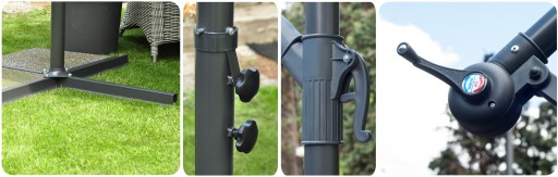 - Możliwość dowolnego ułożenia parasola: wysokość + kąt nachylenia