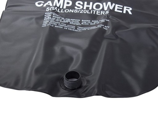 Zawieszany prysznic kempingowy o pojemności 20 litrów. Przenośny zbiornik na wodę, do której podgrzania wystarczą promienie słoneczne. Dzięki specjalnemu tworzywu, prysznic dobrze pochłania światło, a woda szybko się nagrzewa. Worek możemy złożyć do bardzo kompaktowych rozmiarów. Prysznic posiada słuchawkę z wężykiem i sznurki z haczykami do zawieszenia.