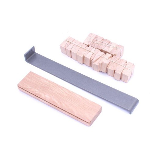 Zestaw drewniany do montażu paneli, mały. Zawiera kliny i dobijak wykonane z drewna.