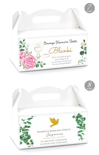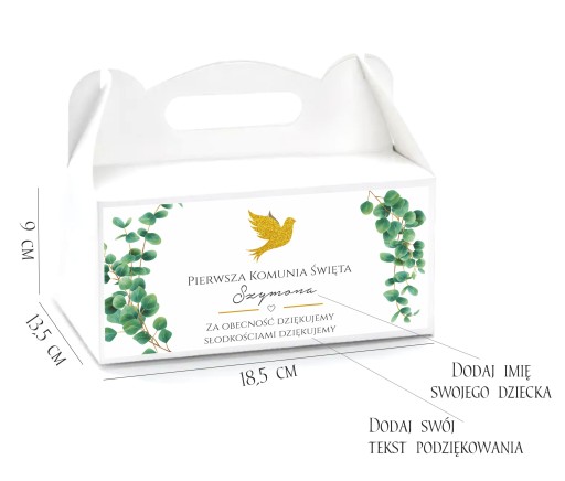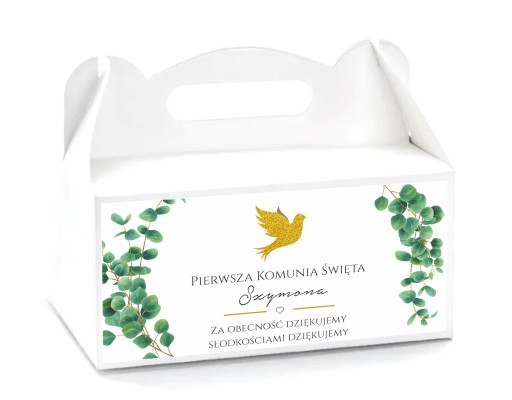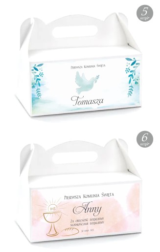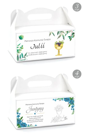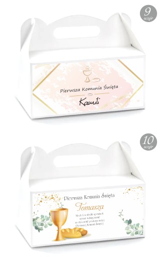 Uniwersalne opakowanie na ciasto komunijne dla chłopca lub dziewczynki, z personalizowaną etykiety (drukowaną na papierze samoprzylepnym do własnego naklejenia)