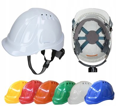 Przemysłowy hełm ochronny z wentylacją, wykonany z polietylenu o dużej gęstości (HDPE).