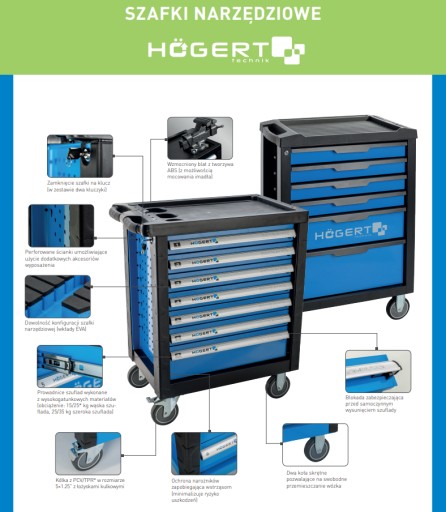 - zamknięcie szafki na klucz, w zestawie 2 kluczyki, zabezpiecza narzędzia przed kradzieżą oraz przed otwarciem szuflad podczas transportu,