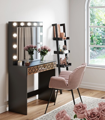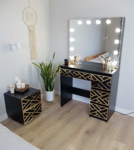 Toaletka wykonana jest z czarnej płyty laminowanej. Front lustra oraz szuflady - płyta połysk.