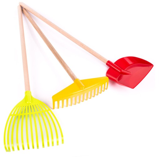 Zestaw narzędzi ogrodowych dla dzieci - grabki, łopatka oraz grabki do liści.