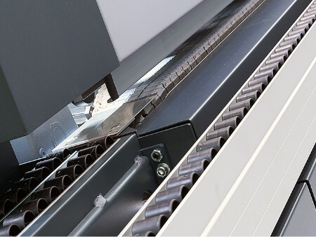 Gilotyna elektro-pneumatyczna obcinające obrzeże z rolki o grubości do 3 mm.